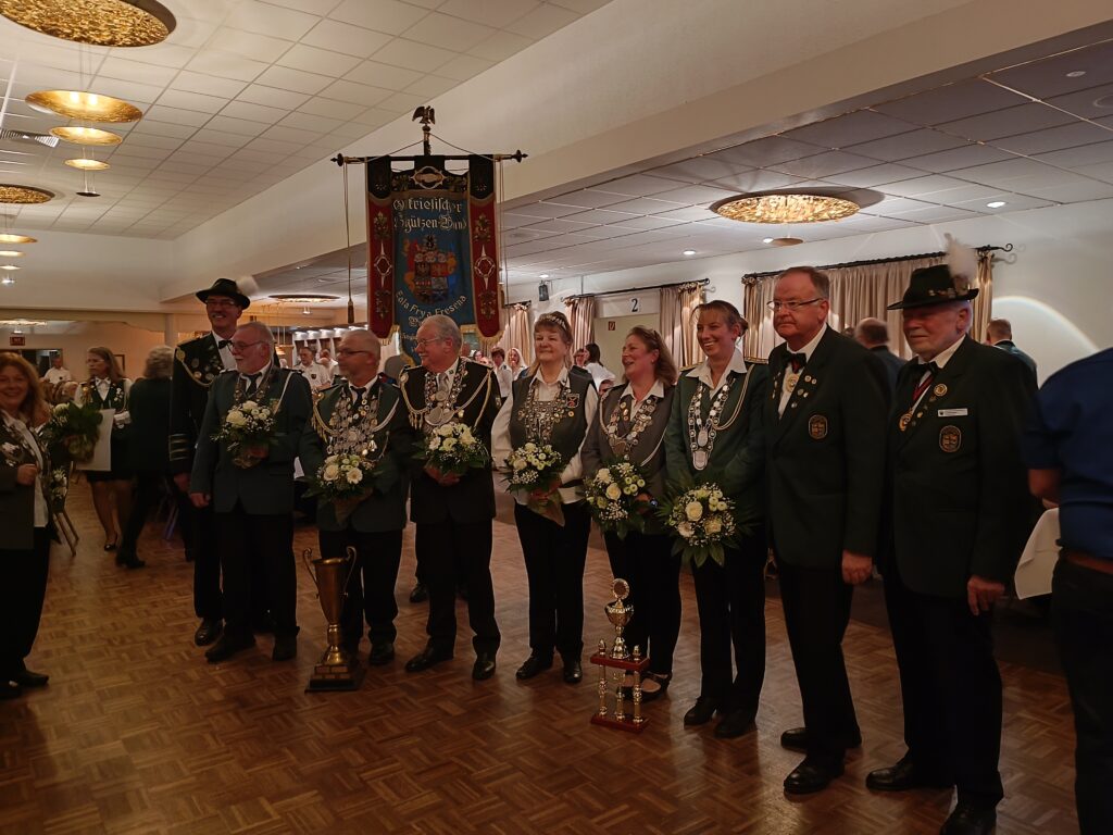 v.L.: 1. Ritter Arno Bach (SV Stickhausen), Bezirkskönig Klaas Hildebrand (SV Victorbur), 2. Ritter Siegfrid Janssen (Auricher SV), 1. Prinzessin Annegret Lottmann (SV Westerholt), Bezirksdamenkönigin Sylvia Schonvogel (SV Germania Middeburg), 2. Prinzessin Ute Müller (SV Neermoor)